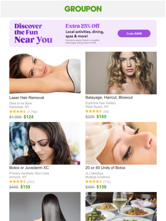 Ad Buy Now Save on Top Restaurants Spas Fitness Goods Travel Events More. 3 or 6 Laser Hair-Removal Sessions for Small Medium or Large Area at Looking Good Med Spa Up. Laser hair removal nj groupon Wednesday March 2 2022 Edit.